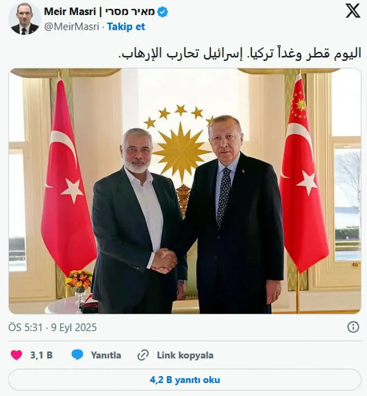 Kudüs İbrani Üniversitesi’nde görev yapan ve aynı zamanda yedek subay olduğu bilinen Meir Masri, sosyal medya platformu X üzerinden yaptığı paylaşımda, “Bugün Katar, yarın Türkiye” ifadeleriyle dikkat çekti.