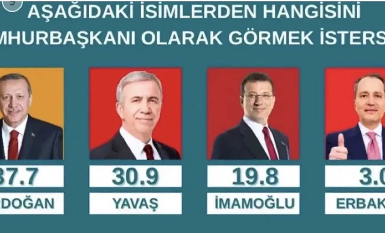 Araştırma sonuçlarına göre, ankete katılanların %37,7’si Recep Tayyip Erdoğan yanıtını verirken, %30,9’u Mansur Yavaş, %19,8’i Ekrem İmamoğlu dedi. Diğer isimler ise daha düşük oranlarda tercih edildi.