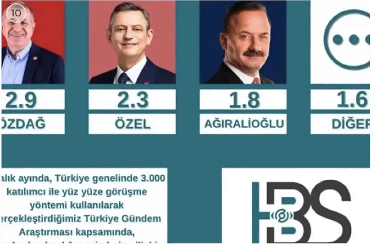 Ankette Fatih Erbakan %3,0, Ümit Özdağ %2,9, Özgür Özel %2,3, Mustafa Sarıgül %1,8 oranında destek alırken, %1,6’lık kesim “diğer” seçeneğini işaretledi.