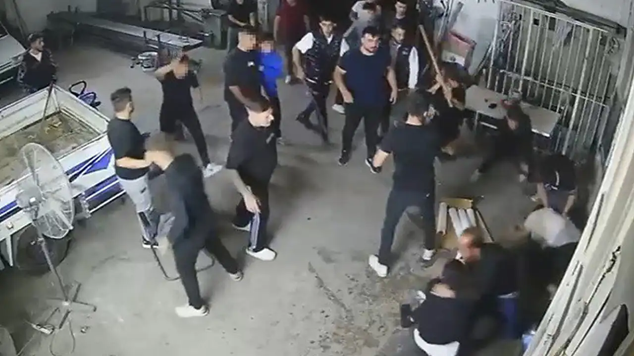 Konya'da bir iş yerine gelen çoğu çocuk yaştakilerden oluşan grubun, iş yeri sahibi iki kardeş ile sopa, kürek ve tüfekle meydan savaşını andıran kavga anı güvenlik kamerasına yansıdı.