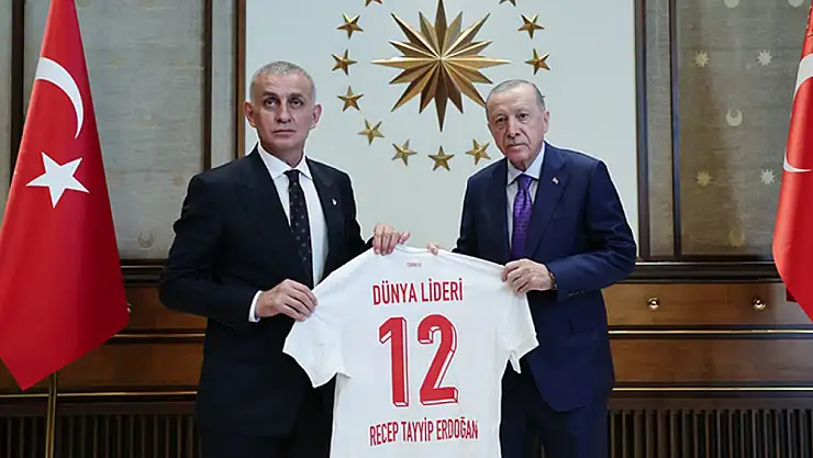 TFF Başkanı İbrahim Hacıosmanoğlu, Cumhurbaşkanı Erdoğan'a arkasında "Dünya Lideri" yazan forma hediye etti.