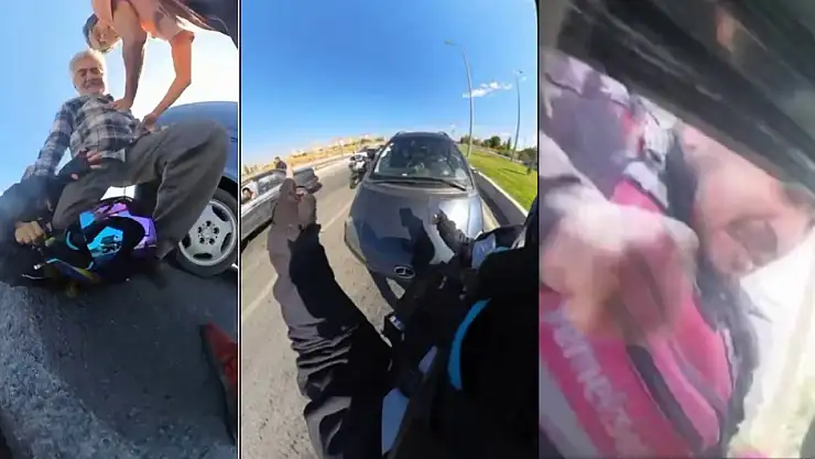 Kayseri'de trafikte yol verme kavgasında bir sürücü, kadın motosiklet sürücüsünü darbetti. Kadının erkek arkadaşına haber vermesi üzerine aracı takip eden şahıs da, kız arkadaşını darbeden sürücüyü dövdü. O anlar kameraya yansırken, polis ekipleri 2 kişiyi de gözaltına aldı.