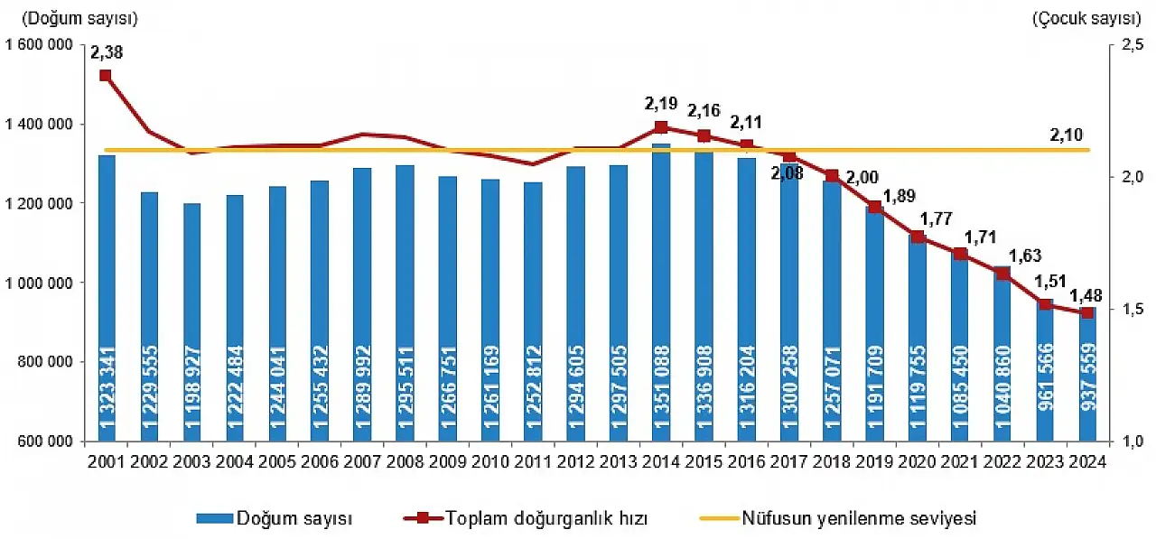 Toplam doğurganlık hızı 2024 yılında 1,48 çocuk olarak hesaplandı. Bu değer, nüfusun kendini yenileme eşiği olan 2,10’un oldukça altında kalırken, doğurganlık hızındaki düşüşün 2014’ten bu yana kesintisiz sürdüğü gözlemlendi.