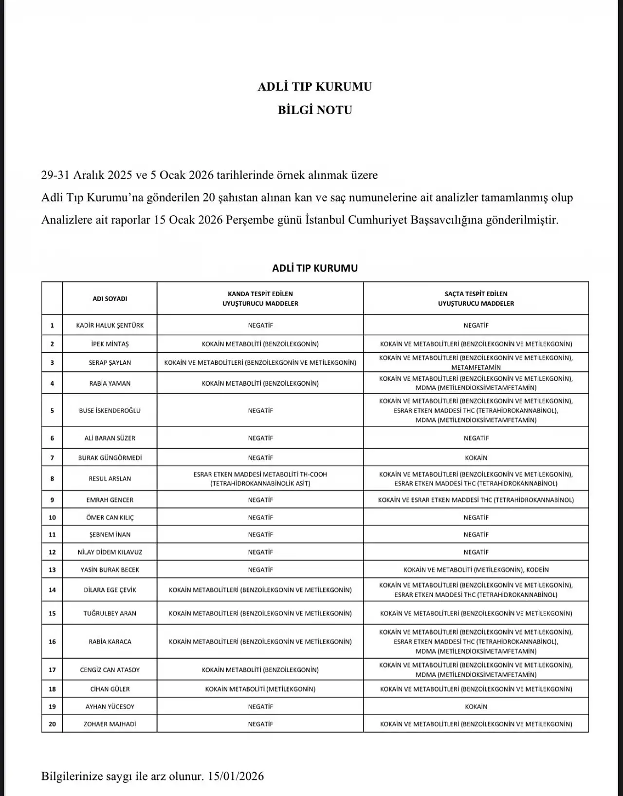 Adli Tıp Kurumu'nca yapılan incelemelerde, sanal medya ünlüsü Rabia Karaca, Miss Türkiye 2016 güzeli manken Buse İskenderoğlu, İpek Mintaş, Serap Şaylan, Rabia Yaman, Burak Güngörmedi, Resul Arslan Emrah Gencer, Yasin Burak Becek, Dilara Ege Çevik, Tuğrulbey Aran, Cengiz Can Atasoy, Cihan Güler, Ayhan Yücesoy ve Zohaer Majhadi'de 'kokain' maddesi tespit edildi.