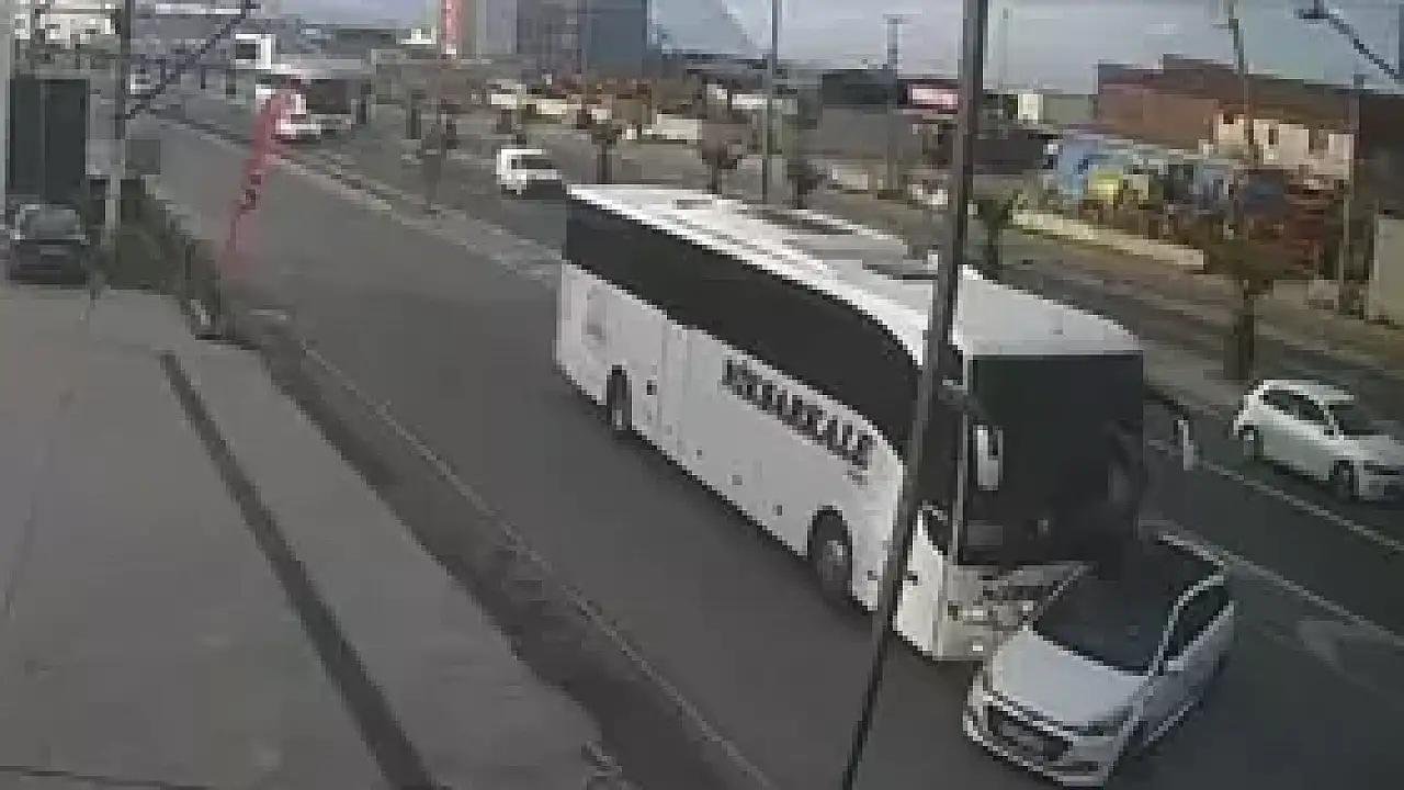 Manisa'nın Turgutlu ilçesinde yolcu otobüsünün çarptığı otomobildeki 1'i çocuk, 3 kişi yaralandı. Kaza bir iş yerinin güvenlik kamerasına yansıdı.